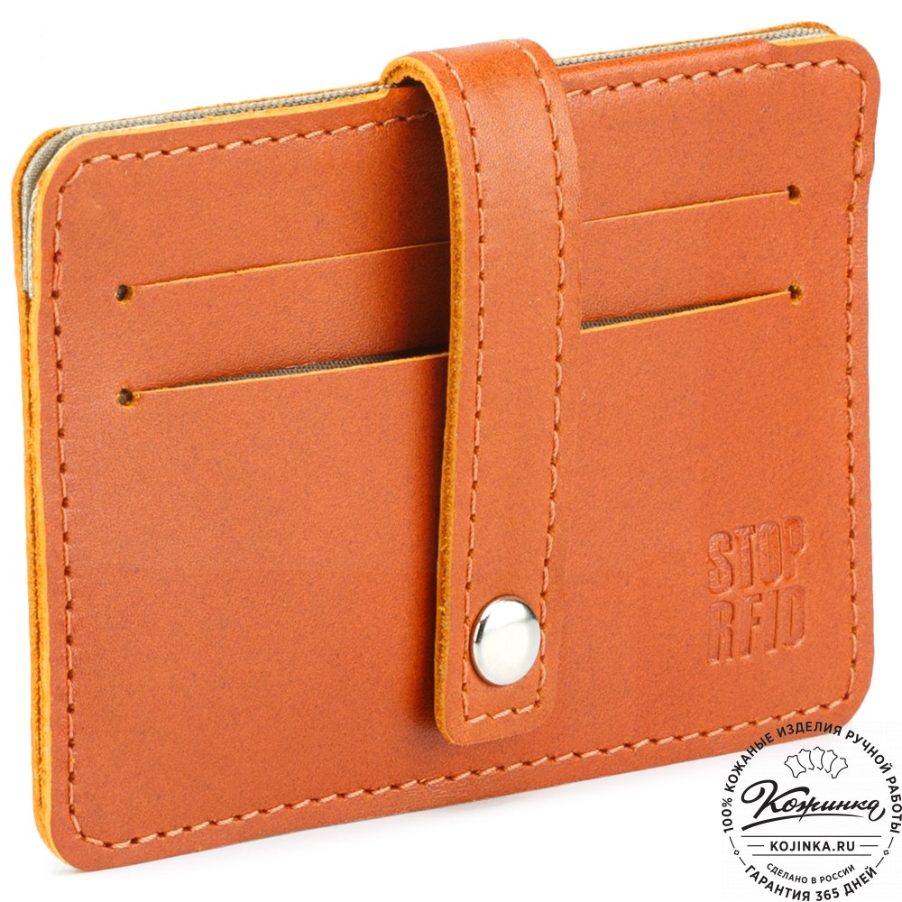 Кожаный хлястик с кнопкой дополнительно фиксирует карты.