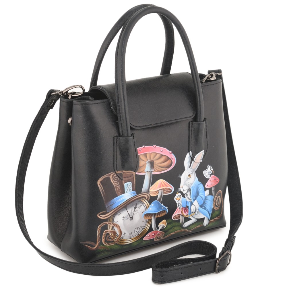 Сумку украшает оригинальный рисунок - это уникальная роспись по коже. каждая сумка расписывается мастерами вручную, потому точных повторений не существует.