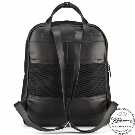 У рюкзака две удобные ручки, которые скрепляются вместе кожаным обёртышем на кнопке.