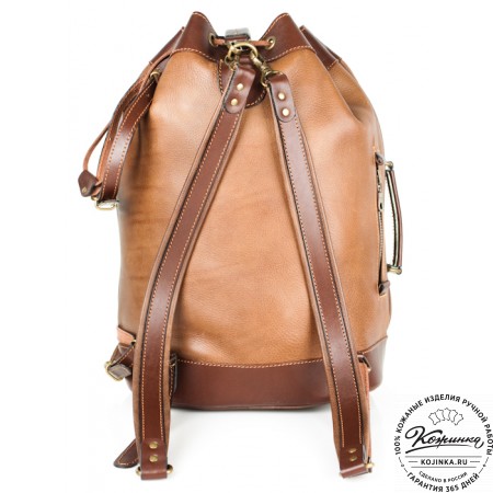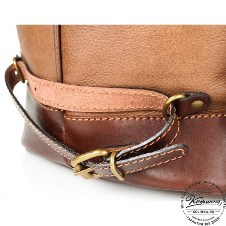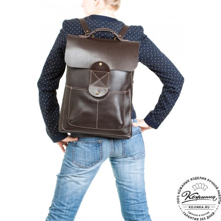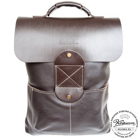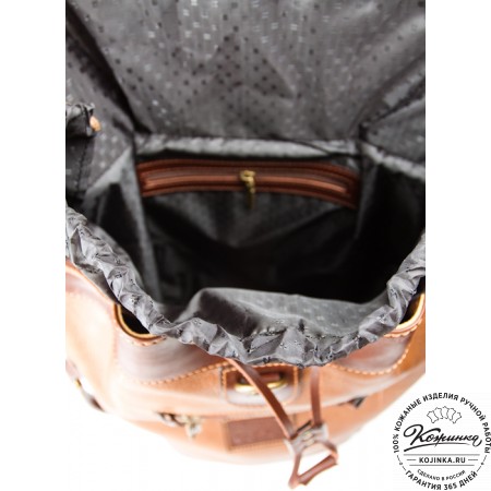 Внутри одно вместительное отделение, с кармашком на молнии. Красивая и крепкая клетчатая подкладка. На наружной части два объёмных накладных кармана на классических замках. Крепкие удобные регулируемые лямки. Можно отнести к унисекс модели. Рюкзак выполнен из комбинации толстой кожи мягкой и жёсткой (клапан рюкзака).