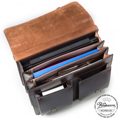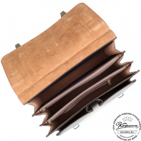 Эта модель портфеля на 2 отделения и еще 1 отделение между отделами на молнии для бумаг. Внутри имеются отделения для телефона, ручек и визиток.