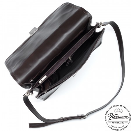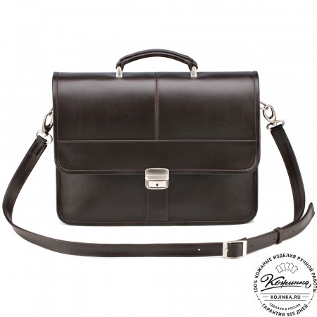 На модели представлен портфель "Версаль" из кожи Антик коричневого цвета.